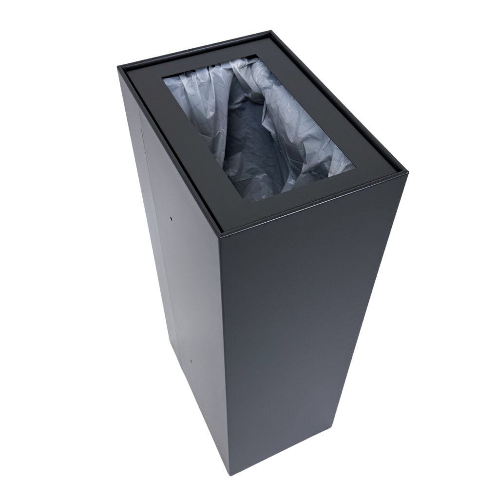 Horní víko s otvorem pro vhazování odpadu je vyrobeno z práškově lakované oceli a připevněno pomocí šroubů. Po odšroubování jej lze jednoduše zvednout a získat přístup k držáku sáčku, který umožňuje pohodlné vložení a vyjmutí odpadového pytle.