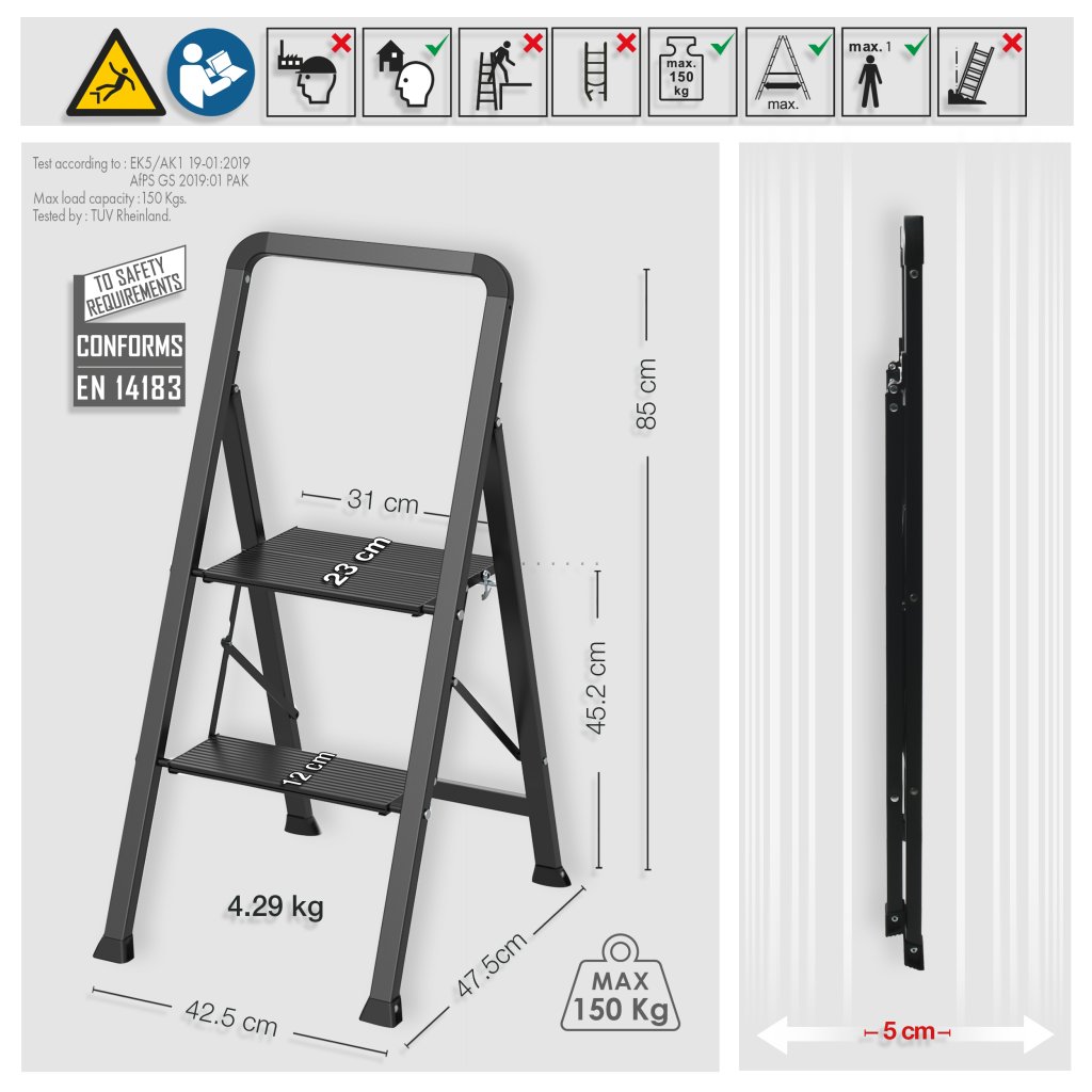 Tyto ocelové dvoustupňové štafle jsou ideálním pomocníkem pro domácnost i dílnu. Díky pevné konstrukci unesou až 150 kg a odpovídají přísným bezpečnostním normám GS. Protiskluzové schůdky poskytují stabilitu a bezpečnost při každém kroku, zatímco gumové nožičky chrání podlahu před poškrábáním. Štafle jsou navrženy tak, aby byly ve složeném stavu extrémně ploché, což usnadňuje jejich skladování i v malých prostorech.