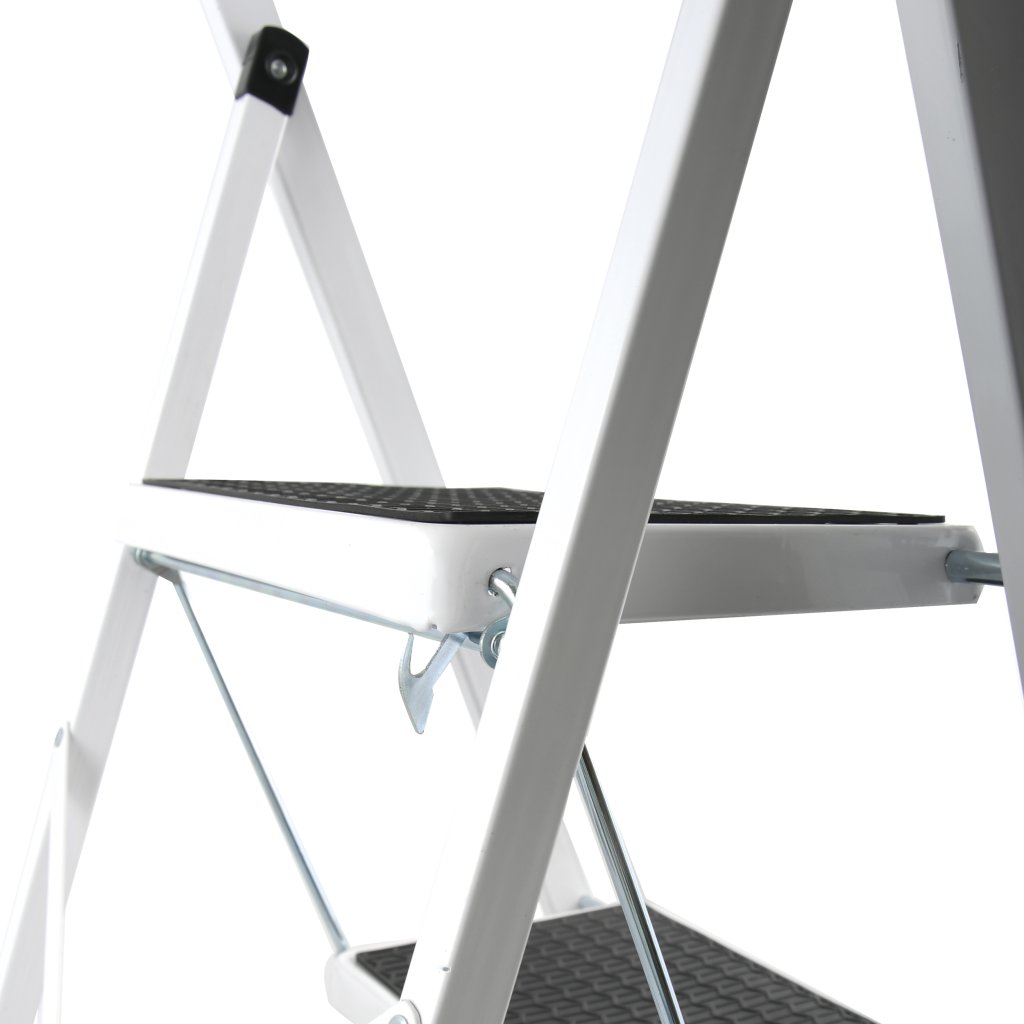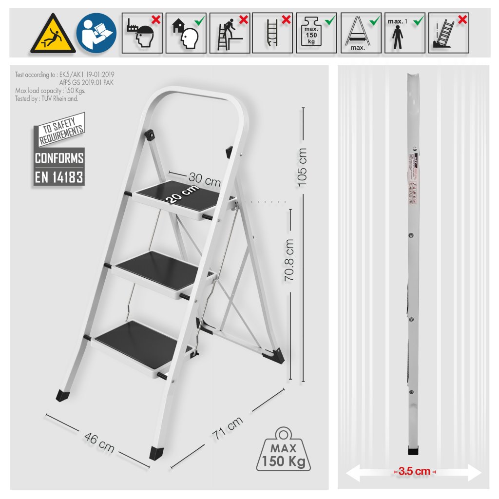 Třístupňové štafle jsou ideálním pomocníkem pro domácí i kutilské práce. Jsou vyrobeny z pevné oceli a splňují bezpečnostní normy GS, což zaručuje jejich stabilitu a bezpečné používání. Protiskluzové schůdky minimalizují riziko uklouznutí a gumové nožičky chrání podlahu před poškrábáním. Díky plochému skládacímu designu je lze snadno uskladnit i v malých prostorech.