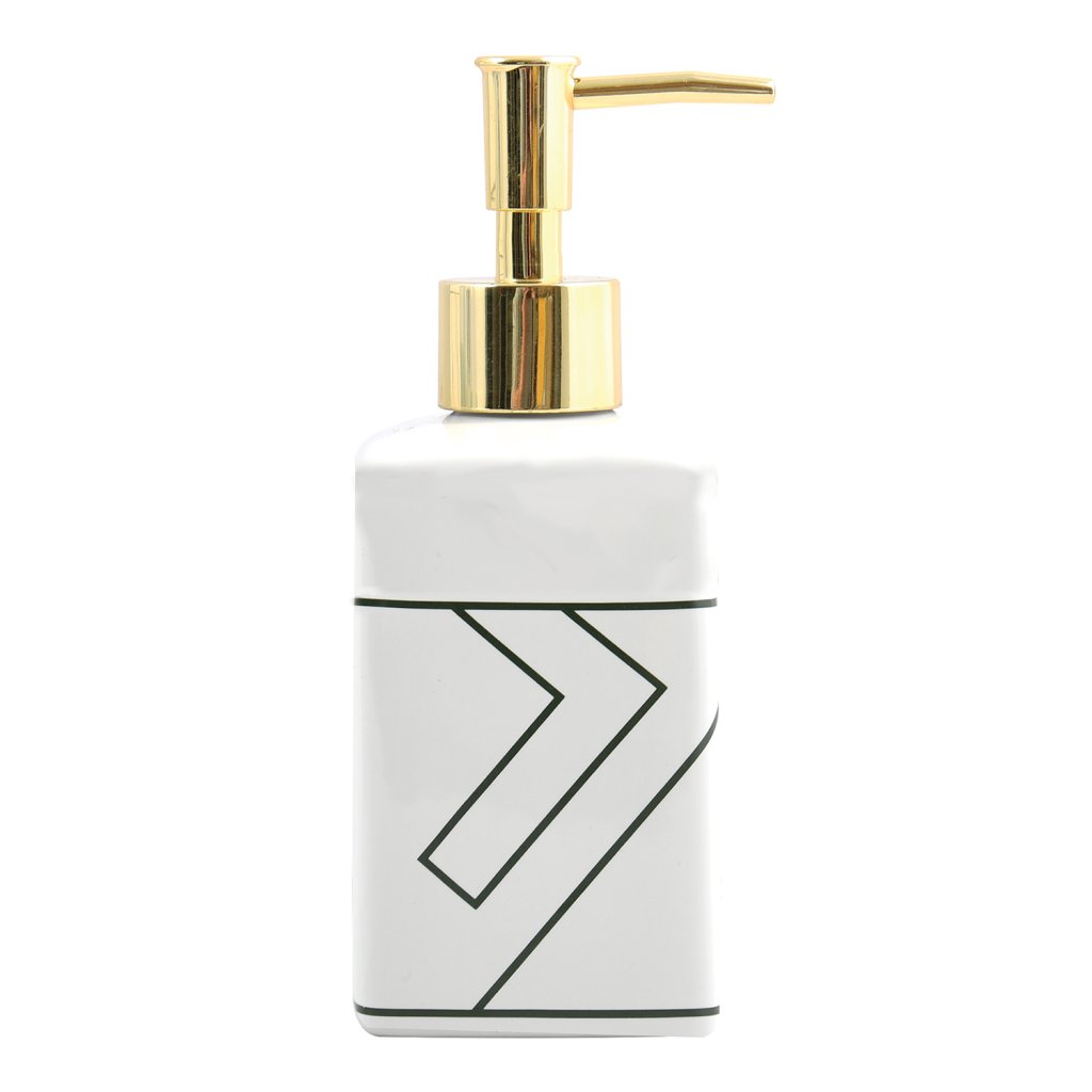 Dávkovač mýdla MONOLITHIC od MSV s objemem 295 ml přináší bílou keramickou nádobu s černým geometrickým vzorem kombinovanou zlatou pumpičkou, která podtrhuje elegantní design a zároveň zajišťuje pohodlné dávkování. Stylový doplněk, který skvěle zapadne do moderních i glamour interiérů.