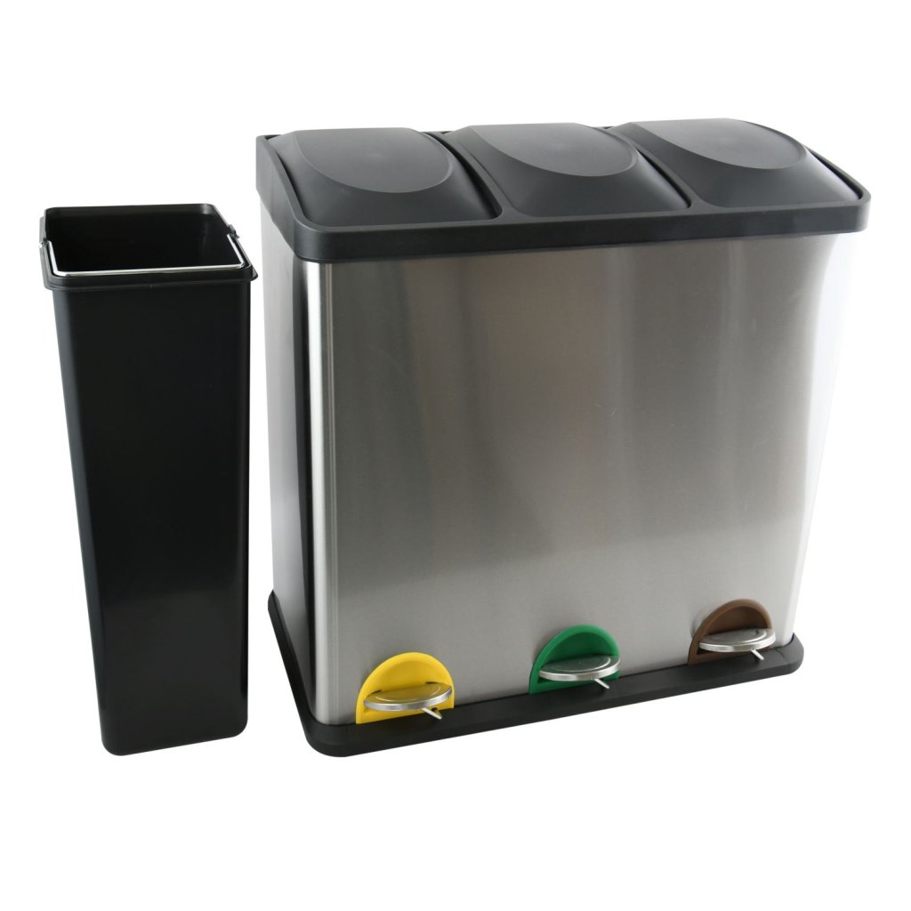 Odpadkový koš na tříděný odpad ze série TRI SELECTIF značky MSV o objemu 3 x 20 L. Má protiskluzové pedály s barevným označením pro snadné otevírání a třídění. Vyroben z kvalitní nerezové oceli, s vyjímatelnými nádobami z recyklovaného plastu pro snadné čištění a s víky zadržující pachy.