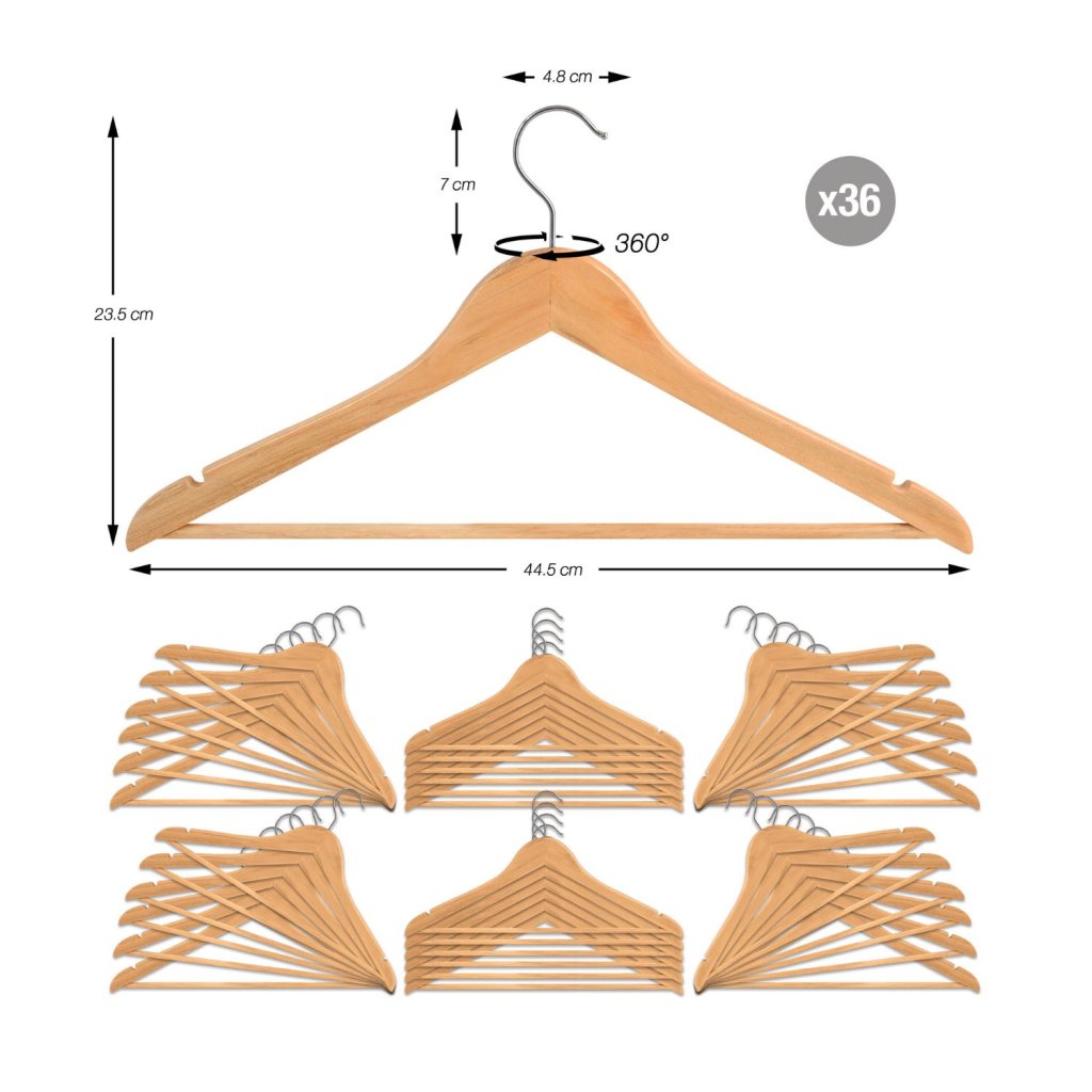 Sada 36 dřevěných ramínek od značky MSV je praktickým a elegantním řešením pro přehledné uspořádání vašeho šatníku. Kvalitní dřevěné provedení zajišťuje pevnost a dlouhou životnost, díky čemuž jsou ramínka vhodná pro každodenní používání i těžší oděvy. Každé ramínko má šířku 44,5 cm a výšku 23,5 cm, což poskytuje ideální oporu pro košile, saka, šaty i kabáty. Kovový háček s možností otočení o 360° usnadňuje manipulaci a přizpůsobení zavěšení v jakémkoli typu skříně.