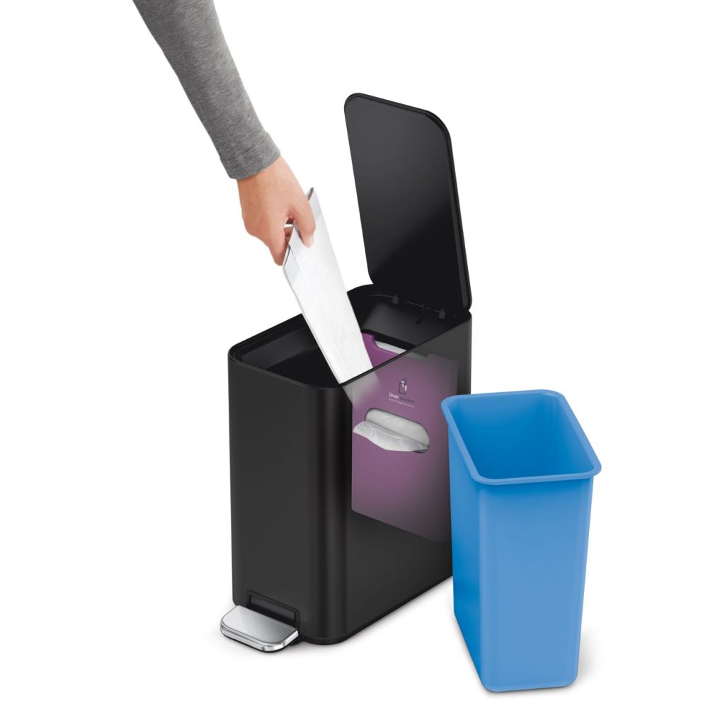 Pedálový koš Simplehuman s velkorysou kapacitou je díky svému útlému designu ideální pro umístění do koupelny nebo jiných prostorově skoupých místností. Vzhledem k elegantnímu zpracování pantů na vnitřní straně, můžete koš umístit přímo ke stěně, aniž by vznikla mezera nebo docházelo k poničení zdi.náhradní sáčky vždy po ruce