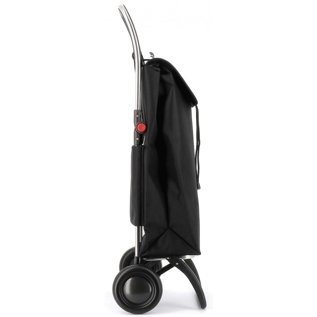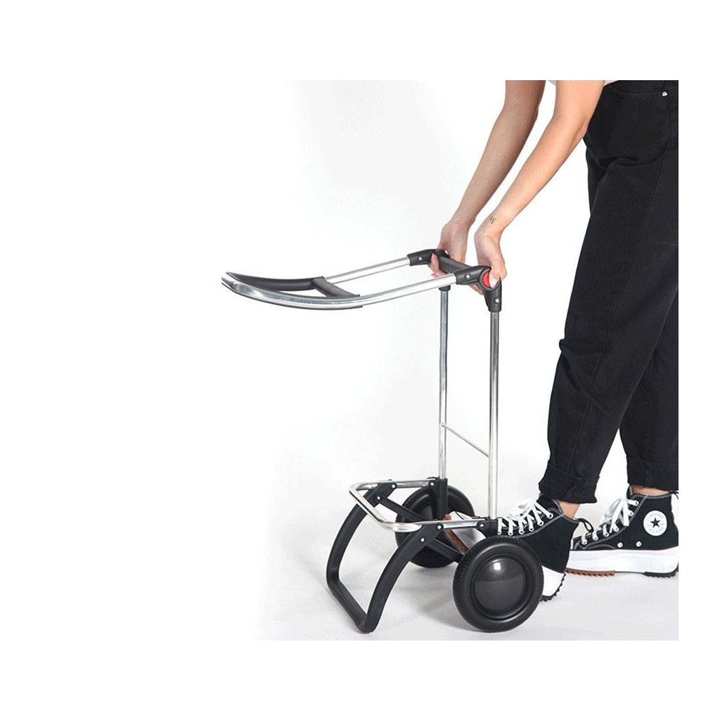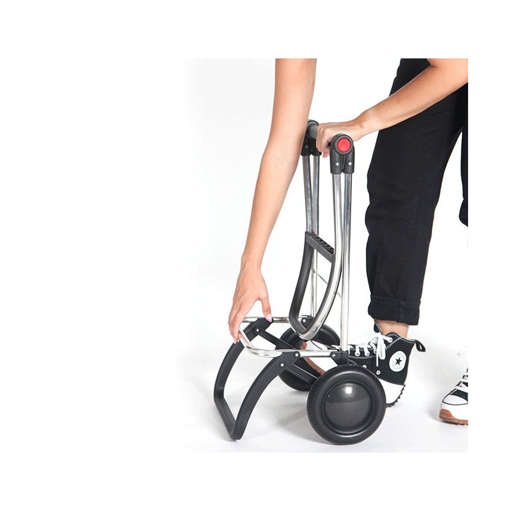 Lehká hliníková kostrukce logic s dvěma koly střední velikosti má hned několik praktických vlastností. Tou hlavní je bezesporu dvojitý skládací systém. Díky němu lze nejen složit přední oporu, která slouží k odstavení tašky do prostoru, ale také samotnou konstrukci. Pomocí bočních ovladačů (červené body) se totiž snadno složí na polovinu a lze ji pak jednoduše uložit nebo převážet v autě. Další praktickou vychytávkou je integrovaný úchyt, který slouží pro zavěšení tašky na nákupní vozík a není tak nutné tašku nikde odkládat. Úchyt je zároveň opatřem drobnými háčky, které při provozu slouží k zavěšení klasických tašek či sáčků. Ergonomické protiskluzové držadlo zajišťuje komfortní úchop a přispívá tak ke snadné manipulaci. Výška konstrukce 104,5 cm je vhodná i pro uživatele vyšší postavy.