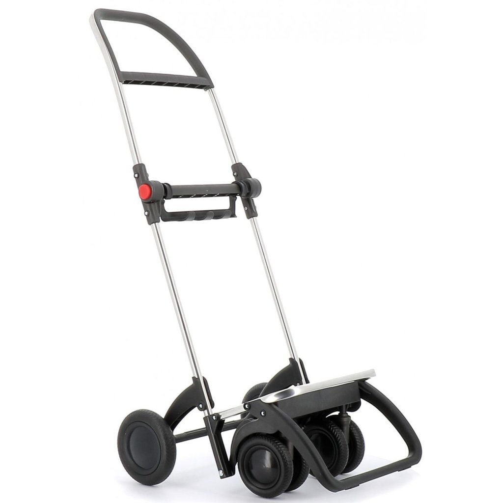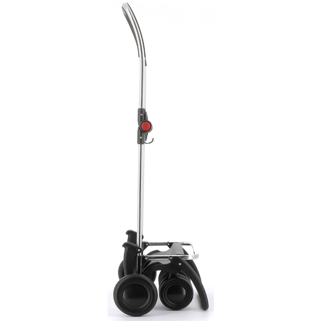 Označení „Logic“ napovídá, že jde o podvozek s duálním skládacím systémem. Díky němu snadno sklopíte nejen přední oporu, ale i celou konstrukci. Stačí stisknout boční ovladače (červené body) a podvozek během okamžiku složíte na polovinu – ideální pro snadné uložení nebo převoz v autě. Praktický adaptabilní háček umožňuje zavěsit tašku přímo na nákupní vozík a vy ji tak nemusíte nikde odkládat. Úchyt je navíc vybaven drobnými háčky, na které pohodlně zavěsíte i klasické tašky nebo sáčky. Ergonomické protiskluzové držadlo zajišťuje pohodlný úchop a snadnou manipulaci. Díky výšce konstrukce 105 cm je podvozek vhodný i pro uživatele vyšší postavy.
