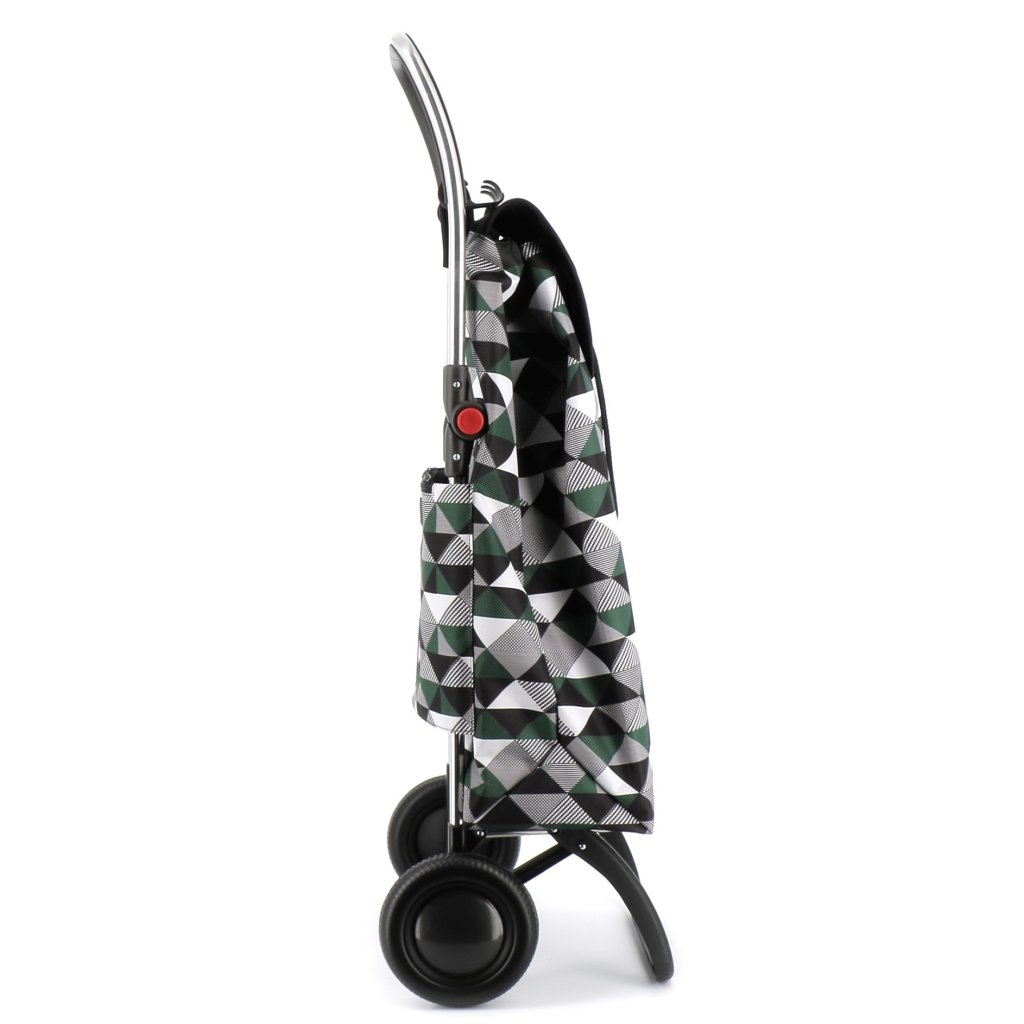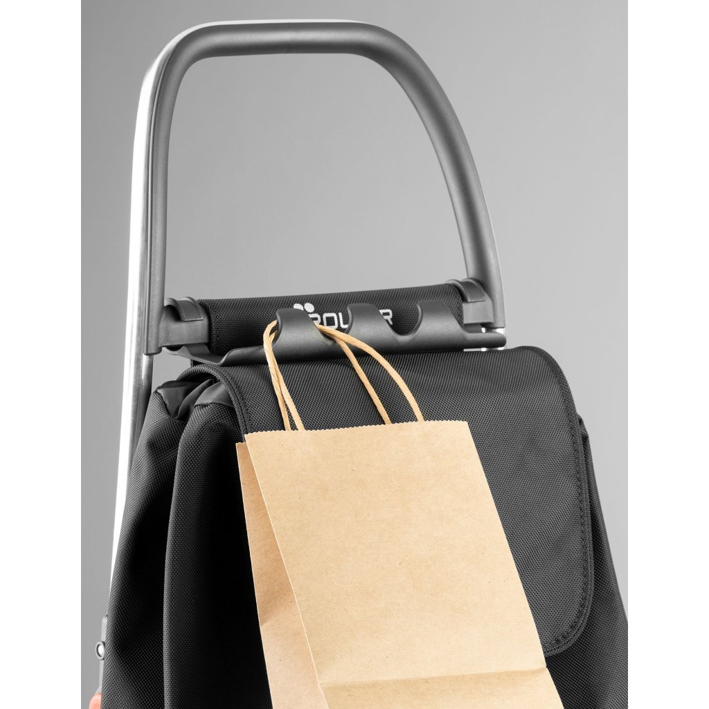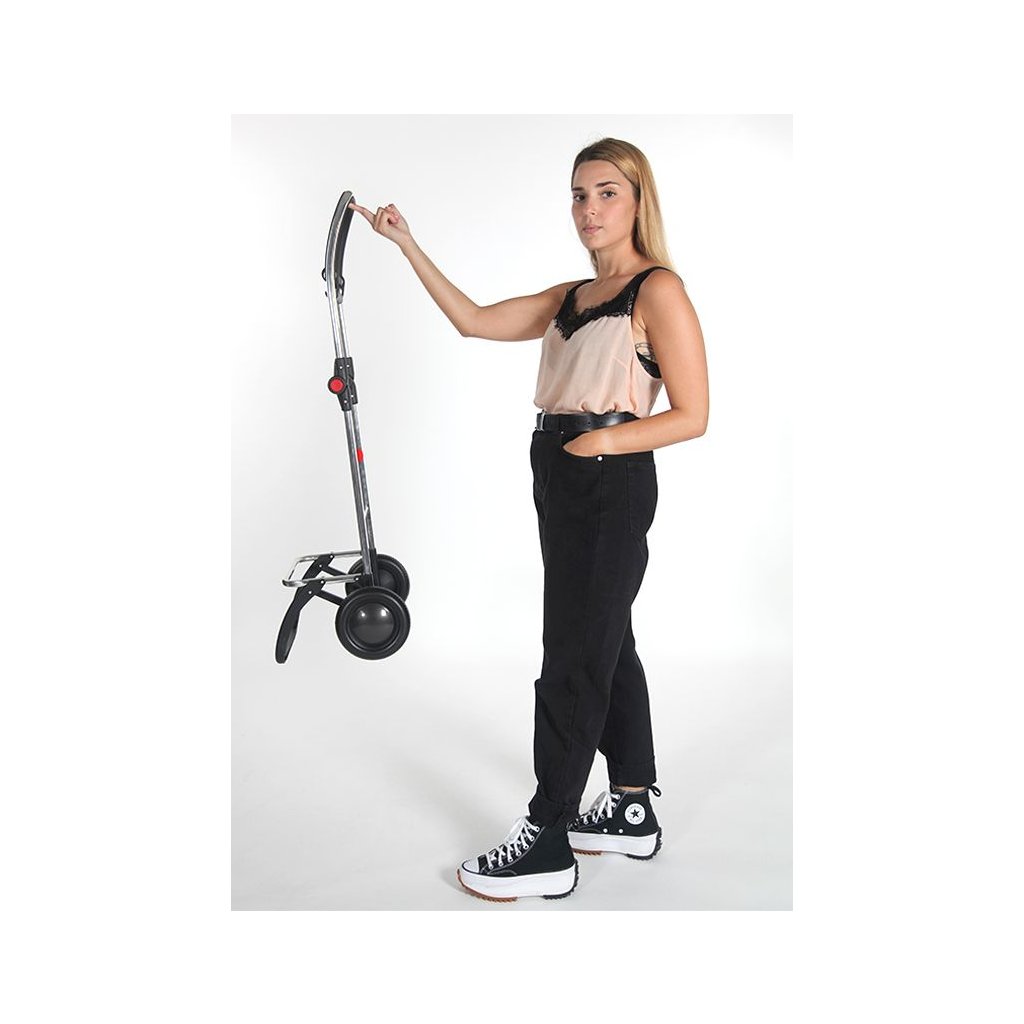 Lehká hliníková kostrukce logic s dvěma koly střední velikosti má hned několik praktických vlastností. Tou hlavní je bezesporu dvojitý skládací systém. Díky němu lze nejen složit přední oporu, která slouží k odstavení tašky do prostoru, ale také samotnou konstrukci. Pomocí bočních ovladačů (červené body) se totiž snadno složí na polovinu a lze ji pak jednoduše uložit nebo převážet v autě. Další praktickou vychytávkou je integrovaný úchyt, který slouží pro zavěšení tašky na nákupní vozík a není tak nutné tašku nikde odkládat. Úchyt je zároveň opatřem drobnými háčky, které při provozu slouží k zavěšení klasických tašek či sáčků. Ergonomické protiskluzové držadlo zajišťuje komfortní úchop a přispívá tak ke snadné manipulaci. Výška konstrukce 104,5 cm je vhodná i pro uživatele vyšší postavy.