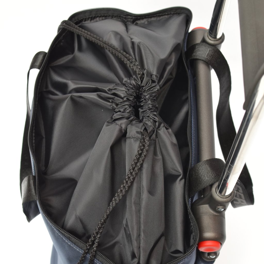 Hlavní úložný prostor tašky Mini Bag nabízí objem 15 L, který lze zvětšit pomocí všitého nástavce až na 21 L. Její maximální nosnost je až 40 Kg, avšak doporučené zatížení 25 kg. Vnitřní prostor je vybaven menší dvojitou kapsou na zip pro bezpečné uložení osobních věcí (peněženka, klíče, mobil), z vnější strany lze pak využít větší kapsu taktéž uzavíratelnou pomocí zipu. Zavírání tašky je řešeno zipem, ale v případě použití nástavce chrání nákup stahovací šňůrka. Taška je na vozík navlečena přes textilní tunel a v horní části připevněna suchým zipem, lze ji tedy použít i bez vozíku jako běžnou tašku nejen na nákup.