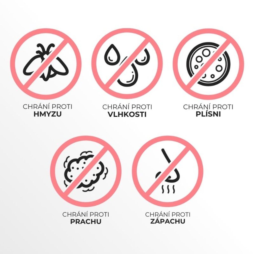 Vakuové úložné pytle Aspispace jsou 100 % hermeticky uzavíratelné díky spolehlivému plastovému zipu s jezdcem. Svoji roli v dokonalé ochraně hraje také vysoce pevný materiál (nylon + polyethylen), který chrání uložený textil před působením vnějších škodlivých vlivů, jako jsou moli, plíseň, vlhkost či obyčejný prach. Materiál nemění textilní vlákno, což v praxi znamená, že vložíte-li do pytle vyprané a vyžehlené prádlo (doporučujeme), ve stejném stavu ho po dekompresi vyndáte.