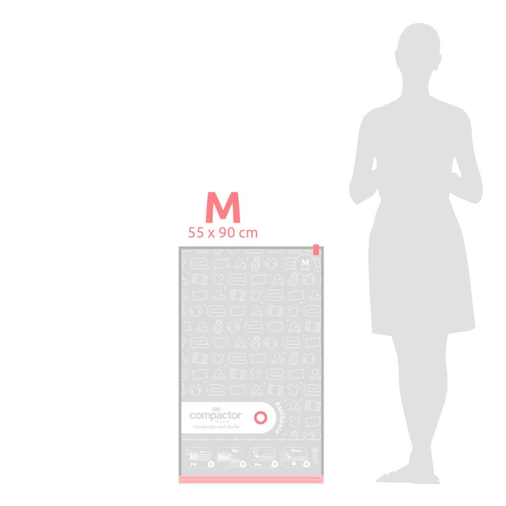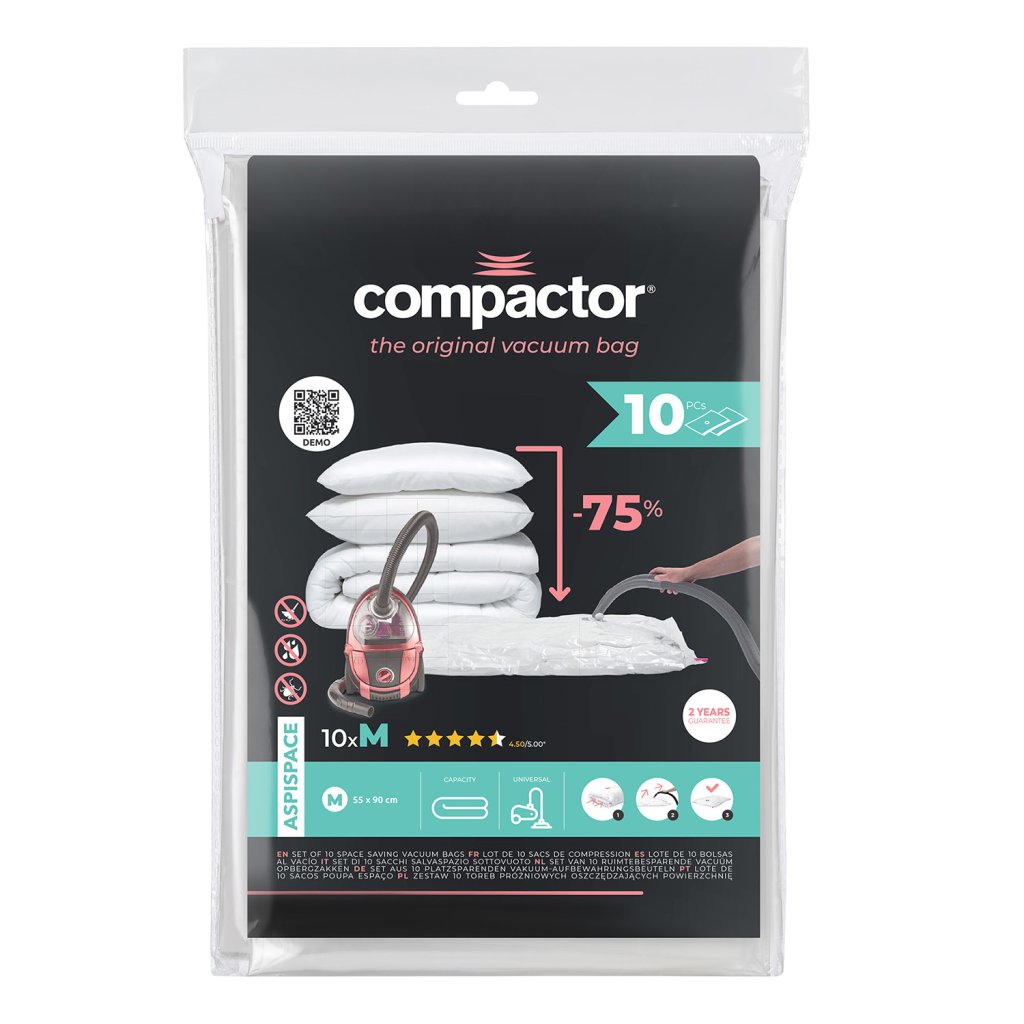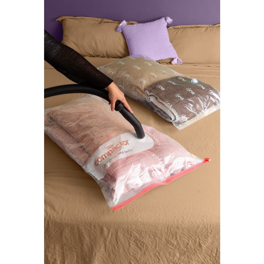 Objevte efektivní způsob skladování s vakuovými úložnými pytli Compactor Aspispace. Tyto prémiové pytle vám pomohou ušetřit až 80 % úložného prostoru a zároveň dokonale ochrání uložený textil před vnějšími škodlivými vlivy. Úsporu místa získáte nejen ve skříních, ale také třeba v cestovním kufru. V praxi to znamená, že např. peřina o tloušťce 50 cm se po odsátí vzduchu zmenší na pouhých 15 cm. Pytle jsou vyrobeny z vysoce kvalitního polymeru s tvarovou pamětí, díky kterému se textilie po dekompresi vrátí do svého původního stavu bez známek poškození. Compactor Aspispace jsou opakovaně použitelné (více než 100 x) a plně recyklovatelné.