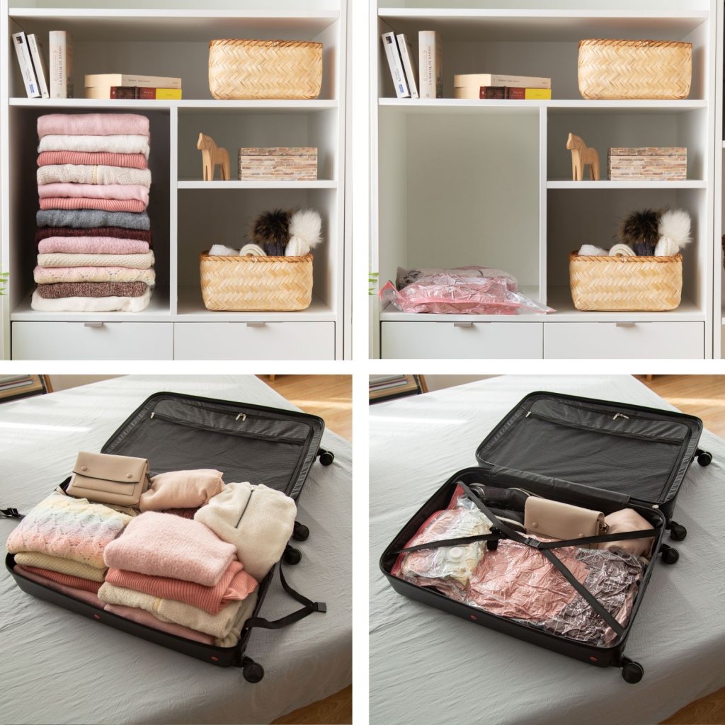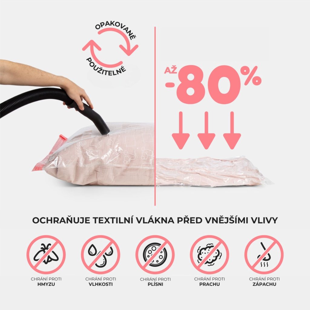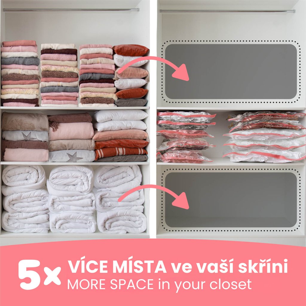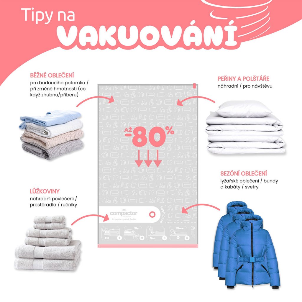 Objevte efektivní způsob skladování s vakuovými úložnými pytli Compactor Aspispace. Tyto prémiové pytle vám pomohou ušetřit až 80 % úložného prostoru a zároveň dokonale ochrání uložený textil před vnějšími škodlivými vlivy. Úsporu místa získáte nejen ve skříních, ale také třeba v cestovním kufru. V praxi to znamená, že např. peřina o tloušťce 50 cm se po odsátí vzduchu zmenší na pouhých 15 cm. Pytle jsou vyrobeny z vysoce kvalitního polymeru s tvarovou pamětí, díky kterému se textilie po dekompresi vrátí do svého původního stavu bez známek poškození. Compactor Aspispace jsou opakovaně použitelné (více než 100 x) a plně recyklovatelné.