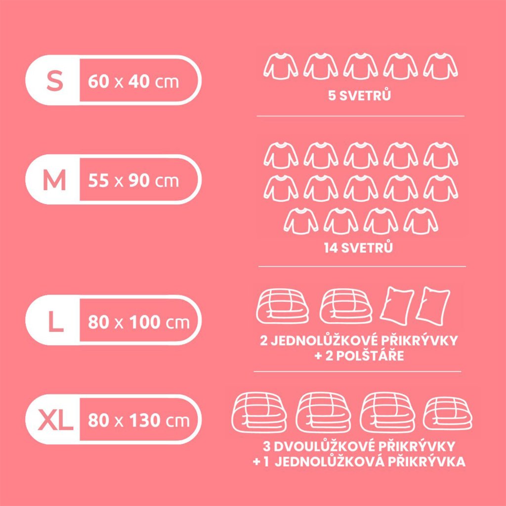 Vakuové pytle Compactor se vyrábějí ve 4 velikostech v rozmezí S - XL. Pro snazší výběr správné velikosti využijte přiloženou tabulku, kde naleznete rozměry jednotlivých velikostí a objemu. Chcete-li vakuové pytle využít na cestování, pořiďte si také univerzální vakuovací pumpu Compactor.