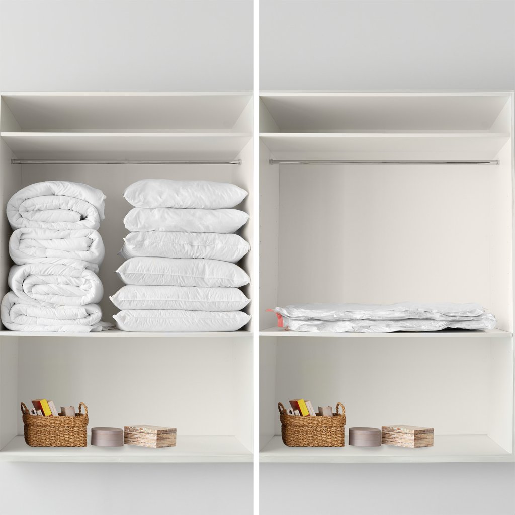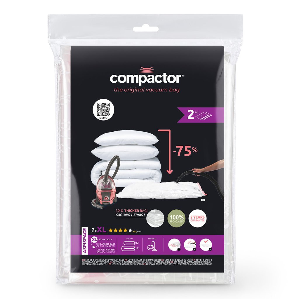 Objevte efektivní způsob skladování s vakuovými úložnými pytli Compactor Aspispace. Tyto prémiové pytle vám pomohou ušetřit až 80 % úložného prostoru a zároveň dokonale ochrání uložený textil před vnějšími škodlivými vlivy. Úsporu místa získáte nejen ve skříních, ale také třeba v cestovním kufru. V praxi to znamená, že např. peřina o tloušťce 50 cm se po odsátí vzduchu zmenší na pouhých 15 cm. Pytle jsou vyrobeny z vysoce kvalitního polymeru s tvarovou pamětí, díky kterému se textilie po dekompresi vrátí do svého původního stavu bez známek poškození. Compactor Aspispace jsou opakovaně použitelné (více než 100 x) a plně recyklovatelné.