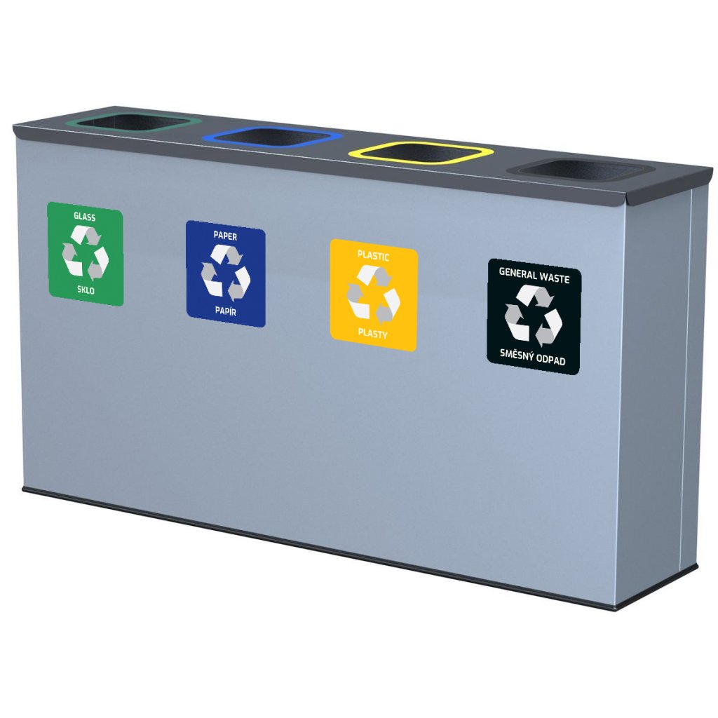 Usnadněte třídění odpadu s touto sestavou na třídění odpadu o objemu 4 x 60 l. Vhodný pro třídění skla, papíru, plastu a směsného odpadu. Z kvalitní lakované oceli s organickou povrchovou úpravou a zárukou 5 let. Hodí se do kanceláří, skladů, nemocnic, hotelů, škol, restaurací i veřejných prostor. Každý koš je barevně označen a opatřen samolepkou v českém a anglickém jazyce, což zaručuje přehledné a efektivní třídění. Díky odnímatelnému hornímu víku a praktickým držákům na odpadkové pytle je údržba hygienická a jednoduchá. K sestavě lze také dokoupit vnitřní ocelové nádoby. Pytel na odpadky pak ohrnete přímo přes horní okraj nádoby. Více informací