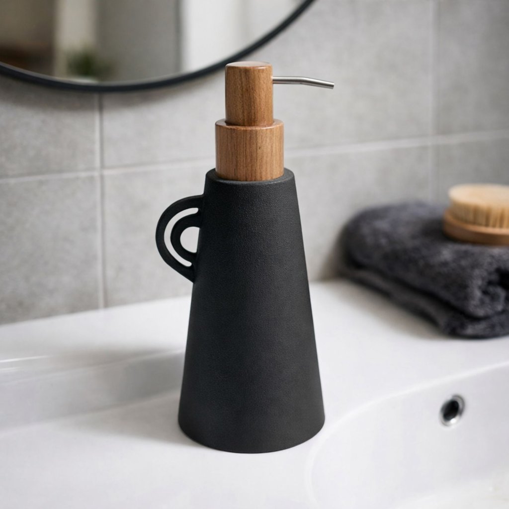 - Keramika s jemnou zrnitou texturou a dřevěnou pumpičkou