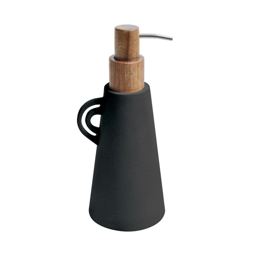 Dávkovač mýdla ORGANIC od značky Spirella spojuje výrazný matně černý povrch s přírodním dřevem akácie.