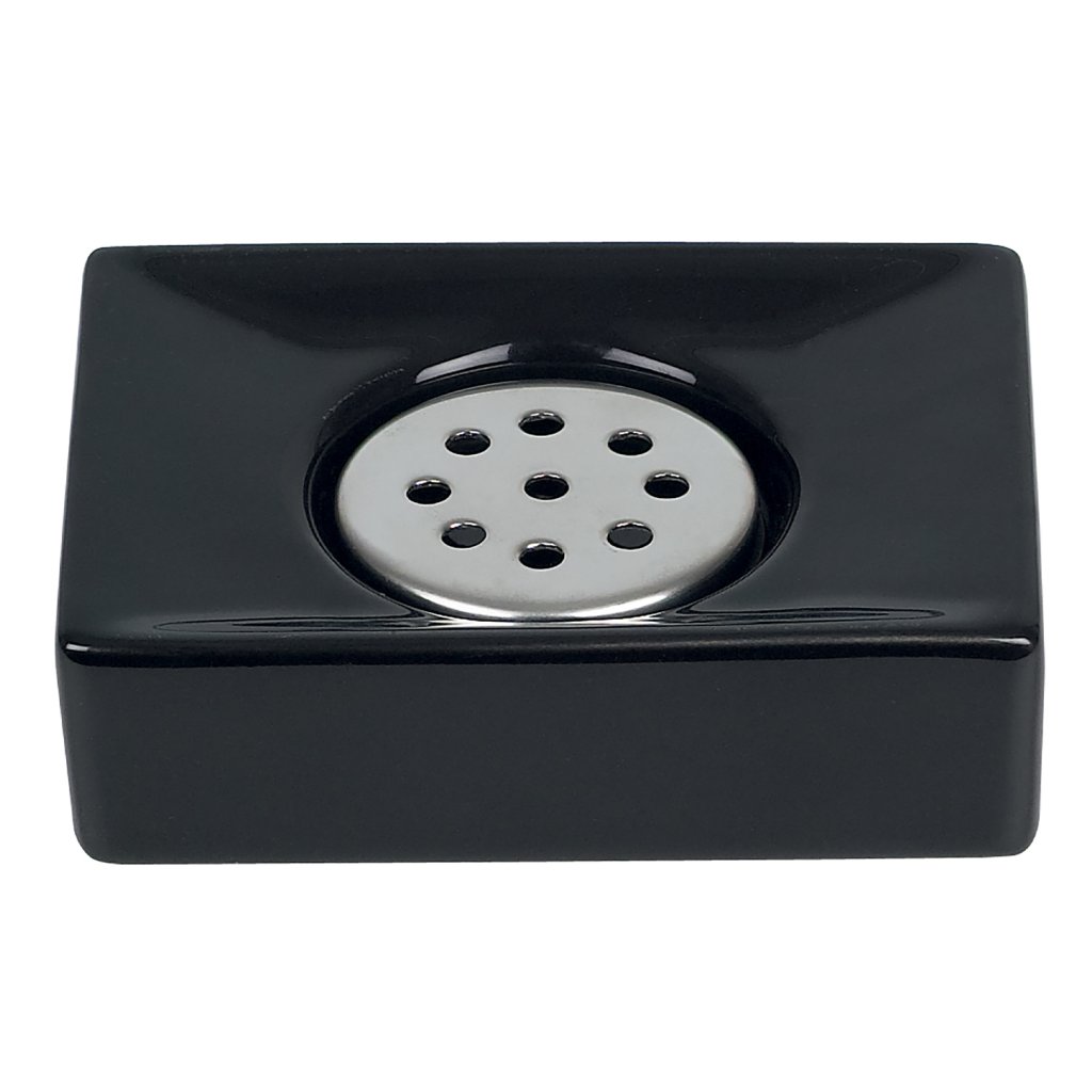 Hranatá mýdlenka ze série QUADRO od značky Spirella z lesklé černé keramiky s chromovanou kulatou vložkou s otvory zajišťuje snadný odvod přebytečné vody, čímž udržuje mýdlo suché a hygienické. Rozměry mýdlenky jsou 11 x 8 x 3,5 cm.Více informací