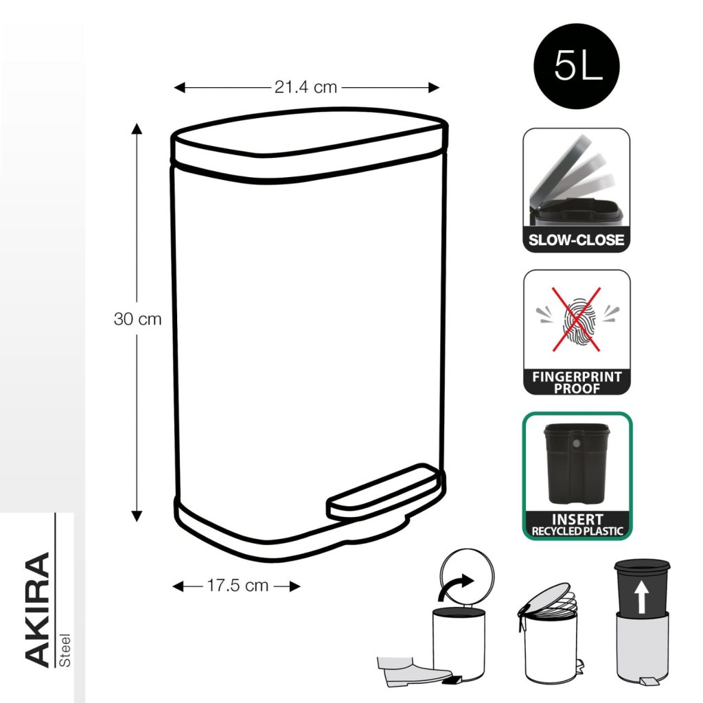 Pedálový odpadkový koš AKIRA od značky Spirella s objemem 5 litrů patří mezi menší koše, které se skvěle hodí do koupelny nebo na WC, kde oceníte hygienické otevírání bez nutnosti dotyku rukou. Zároveň perfektně funguje jako malý koš do pracovny či dětského pokoje – nenápadný, tichý a vždy po ruce. Vyniká matným minimalistickým vzhledem, který působí čistě, moderně a nadčasově.
