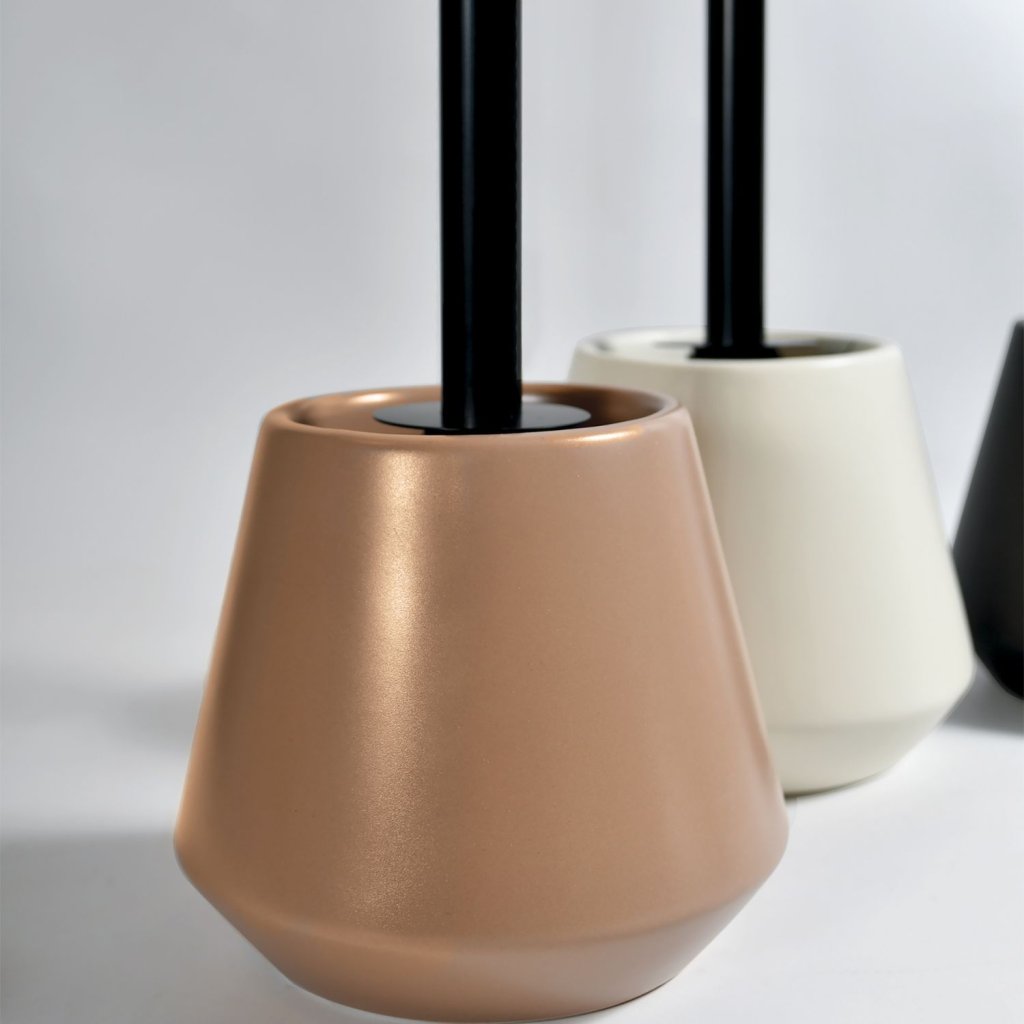 WC štětka JOSHUA od značky Spirella s krémově bílou keramickou nádobou v odstínu ecru a černou rukojetí kombinuje jemný matný vzhled s výrazným detailem.